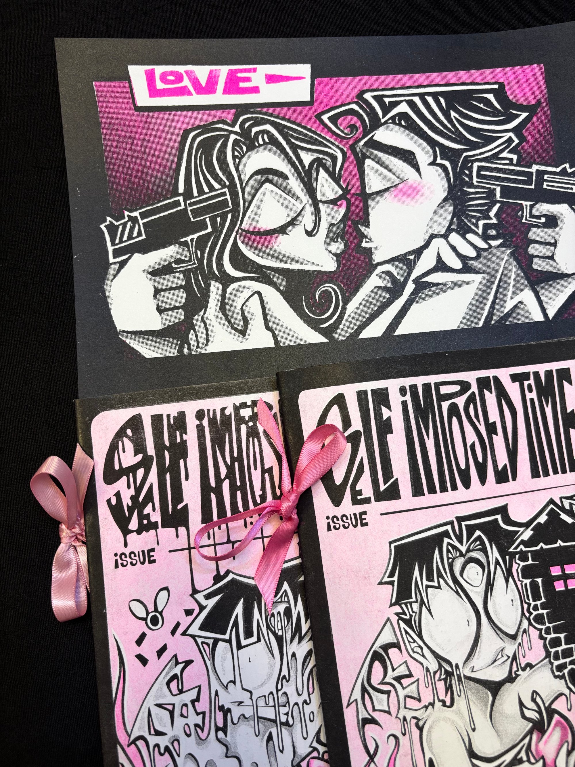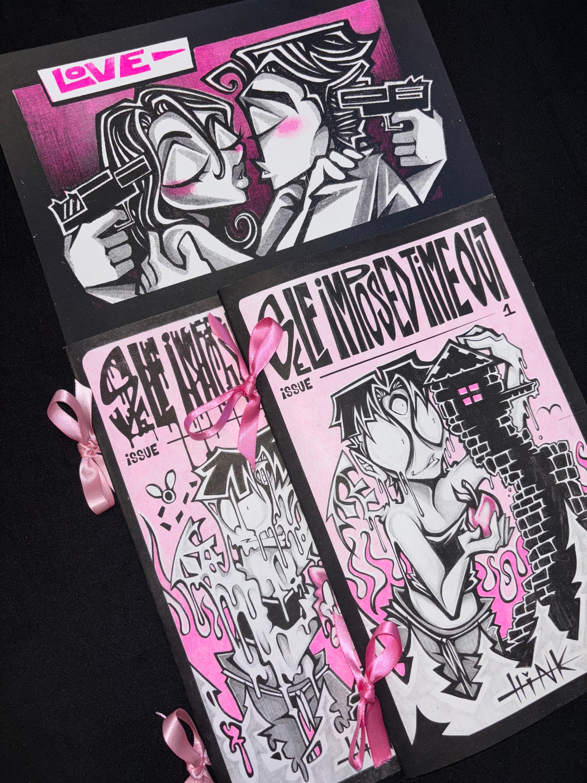 Both issues #1 and #2 of S.i.T.O., ribbon adorned on the staple binding, and issues also come with a 2 layered screen print which features the first panel of the comic.